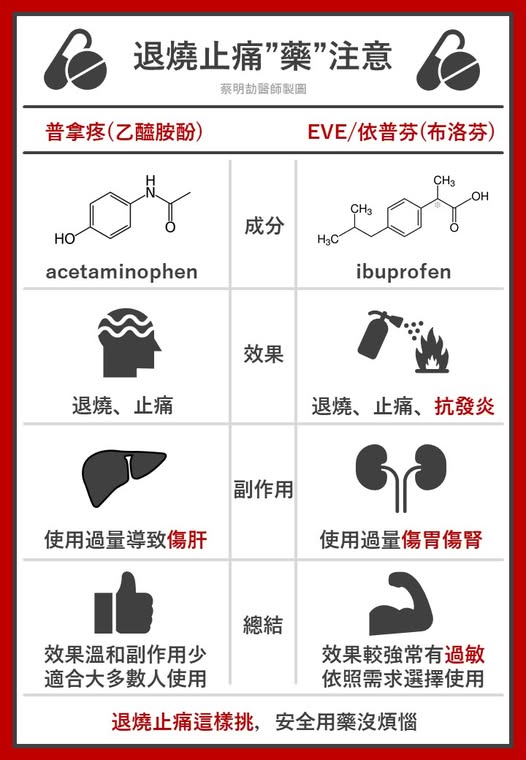 正確用藥很重要,誤用或過量使用才會傷身體。這兩大類退燒止痛藥,蔡醫師從以下3方面幫大家做個做比較: