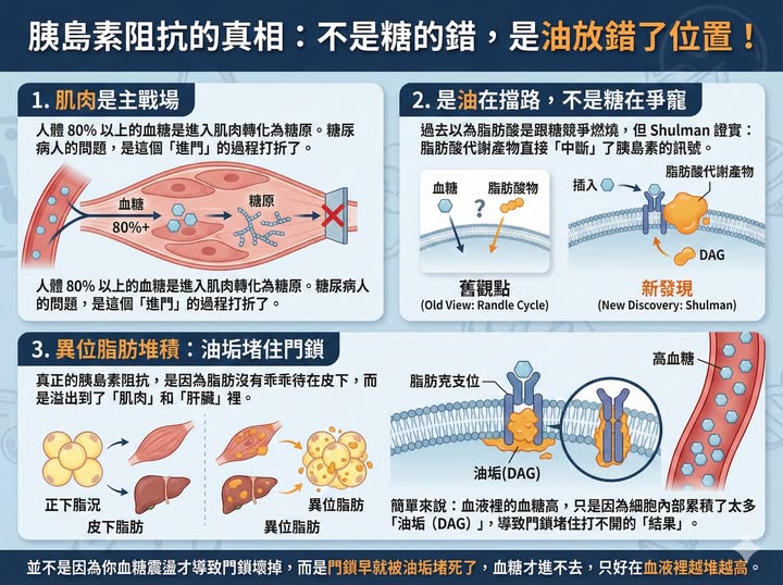 簡單來說:血液裡的血糖高,只是因為細胞內部累積了太多「油垢(DAG)」,導致門鎖堵住打不開的「結果」。