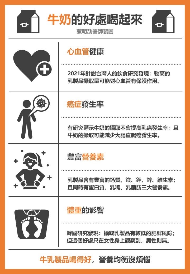 還有2021年針對台灣人的飲食研究發現:包括全脂或是脫脂奶在內,乳製品的攝取與總死亡率呈現負相關,這個好處很可能就是來自對心血管以及三高的保護作用。