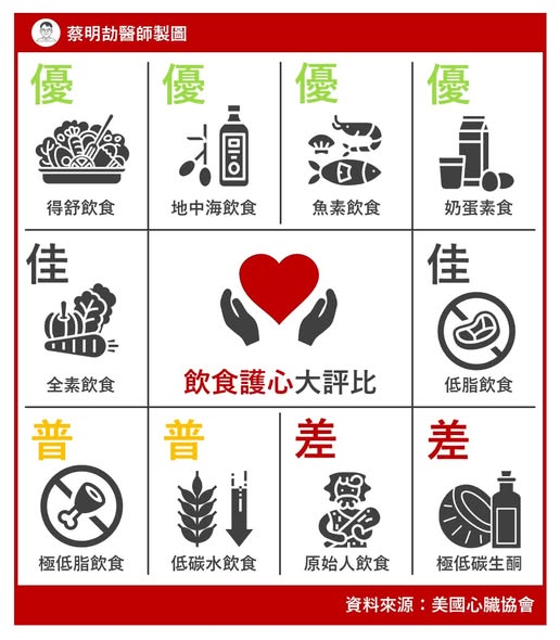 前陣子蔡醫師做了「護心飲食10要點」懶人包,向大家介紹美國心臟協會建議的飲食方針。今天我要貼出續集:「飲食護心大評比」。