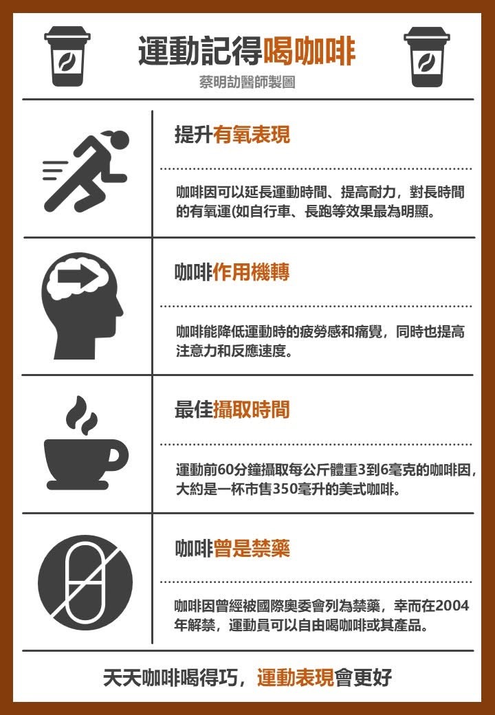 總之,咖啡應該是世界上最多相關研究的「運動補充品」,其他相關資料我會列在留言處。如果你跟蔡醫師一樣想要積極提升運動表現,咖啡這麼好的東西還不喝爆?